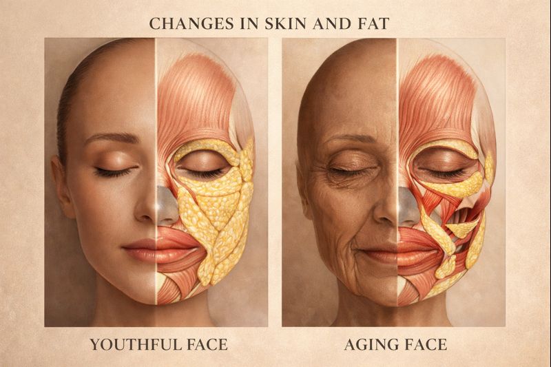 These changes are not abrupt. They reflect cumulative tension, reduced glide and diminished connective strength over time. When fascia loses adaptability, contour appears heavier and lines become more established. Understanding this progression reframes ageing as a structural evolution, not simply a surface concern.